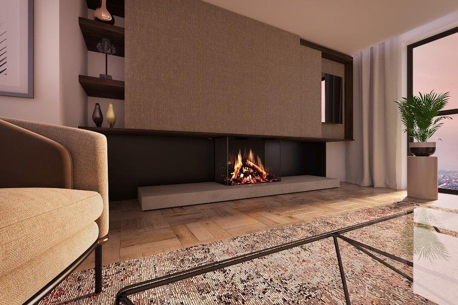 Trojstranné prevedenie krbu so živými plameňmi a zvukom praskajúceho dreva.