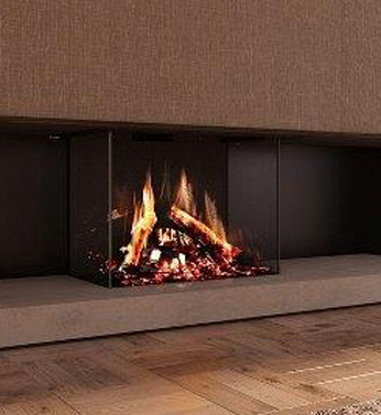 Trojstranné prevedenie krbu so živými plameňmi a zvukom praskajúceho dreva.