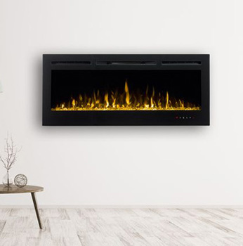 Moderný elektrický krb určený na zabudovanie s polienkami a farebným podsvietením.
