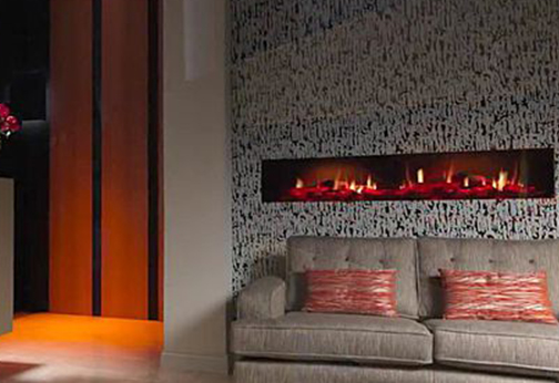 Moderný krb určený na zavesenie na stenu s efektom plameňa Optiflame® a prebleskujúcou pahrebou Optiglo®, s čiernou povrchovou úpravou. Vhodný pre väčšie miestnosti, vytvára pocit tepla a luxusu.