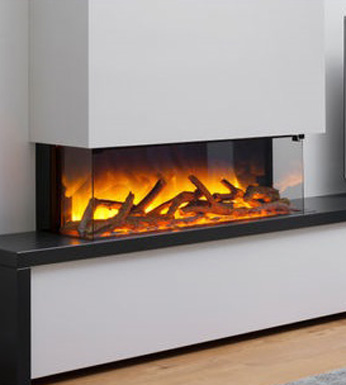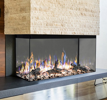 Trojstranný elektrický krb vystupujúci do priestoru s polienkami aj kryštálmi.