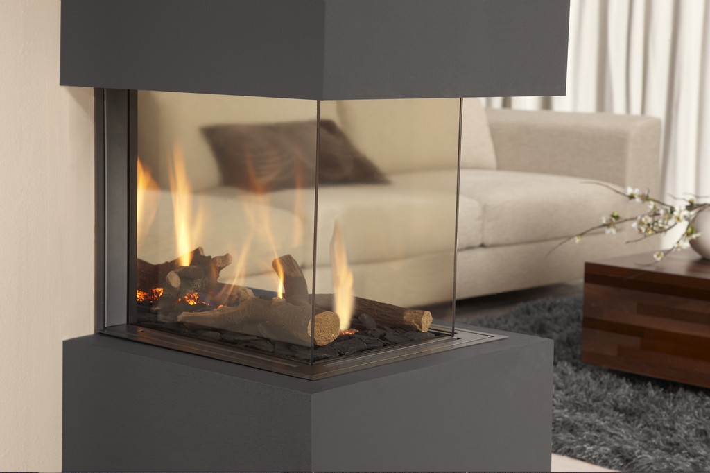 Zaujímavé presklenie horizontálneho krbu na netradičné rozdelenie miestnosti.
