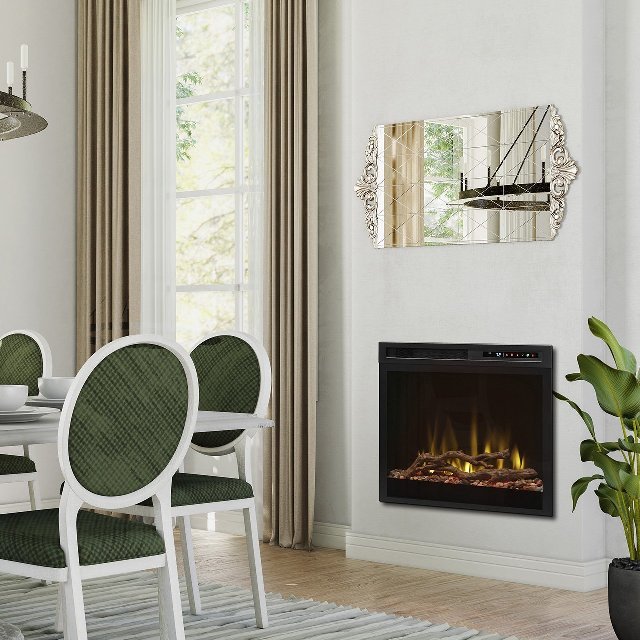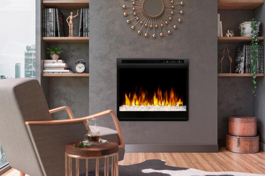 Moderný elektrický krb určený na zabudovanie s polienkami a farebným podsvietením.