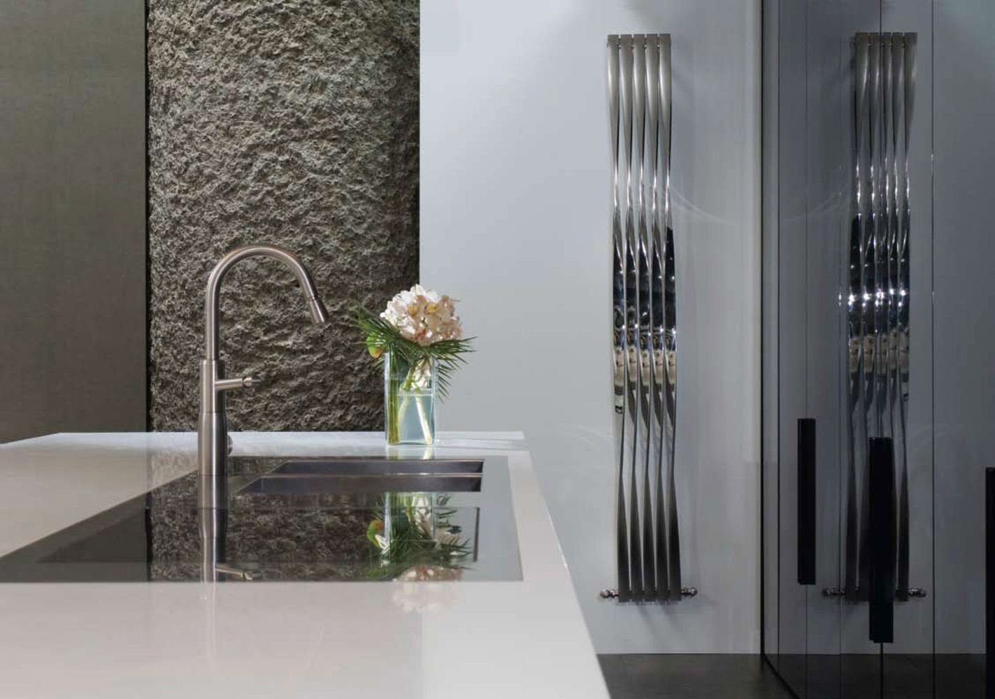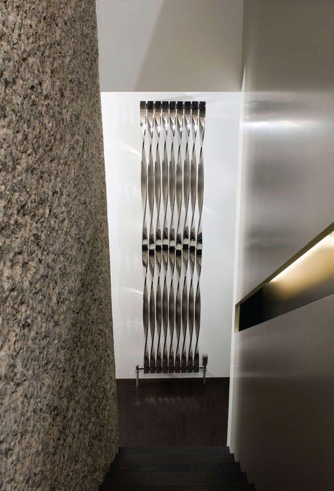 Vzrušujúci nový radiátor Twister s dizajnom, ktorý predstavuje až deväť trikrát pretočených tyčí, ktoré striedavo odhaľujú brúsené a leštené plochy.